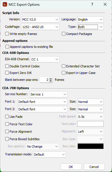 When you click the MCC CEA-708 export, the following dialog will appear: