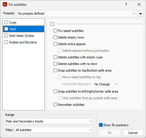 << Click to Display Table of Contents >> Navigation: Quality Control > Fix Subtitles > Text category |