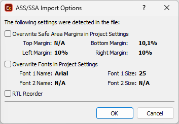 Sub Station Alpha format provides support for extensive number of features including details about the Safe Area margins and font information. Upon importing SSA or ASS file EZTitles offers the possibility to load the original settings saved in the input fie: