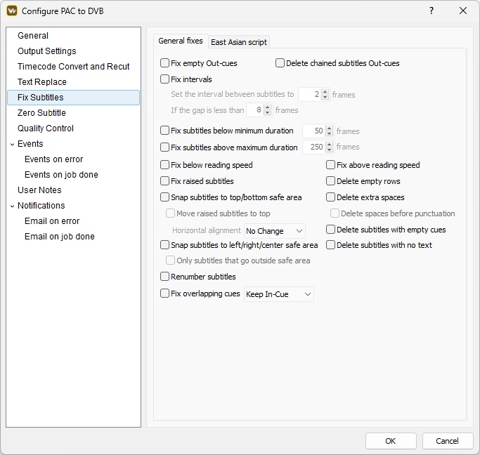 Using these options you can fix certain issues with the input file. The options are described in details with the Fix Subtitles topic. Description of the options dedicated to conversions including subtitles in East Asian languages or vertical text can be found in the Options for East Asian languages section of the Fix Subtitles topic.