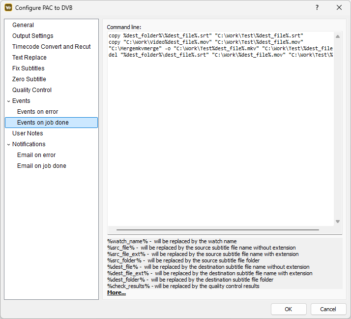 For convenience, different set of commands can be carried out depending on the outcome of the conversion. If the conversion has been successful, then those from the Events on job done section will be executed. Respectively, when the conversion has failed with an error, then those from Events on error will be executed.
