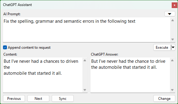 Write your question or instruction for ChatGPT in the AI Prompt field. This can range from a simple query to more complex instructions for processing the text in the Content field, as shown in the picture above. Enable the Append content to request option if you want ChatGPT to perform an action on the text in the Content box.