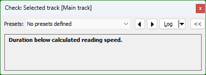 The text specifying the type of the error found in the current subtitle is displayed at the bottom of the window. You can find the next problematic subtitle using the Next and Previous buttons or by assigning shortcuts for the Check Next and Check Previous commands.