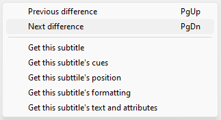 File/Compare active track with... allows you to compare the subtitles in your active track with another track in your project or with a file, in any of the supported formats, saved on your computer and find the differences in subtitles text, positioning, formatting and timing.