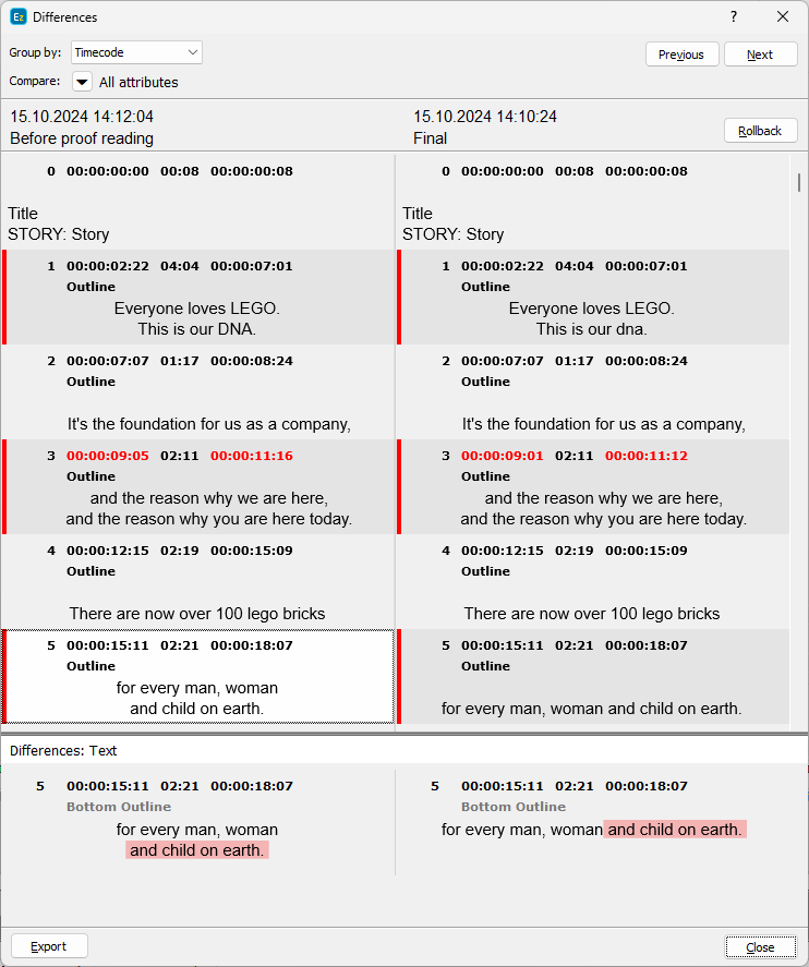 EZTitles also provides options to Export the comparison list as Excel XLS file in case it has to be shared with a colleague. All differences in the formatting (colors, italics, underline), horizontal positioning (alignment, justification), timing and the text itself can be easily recognized.