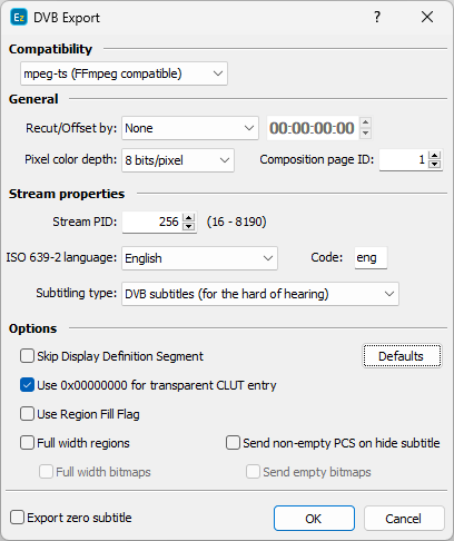 Stream ID - allows you change the PID of the DVB subtitle stream. This option is available only when exporting MPEG-TS (FFMPEG compatible) DVB subtitles.