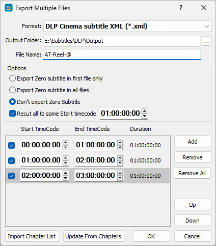 The subtitles will be split into couple of consecutive files by specifying Start and End Timecode points for each individual output file. It is not necessary that the timecode ranges are consecutive.