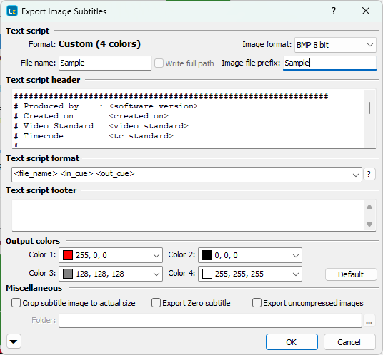 The Custom (4 Colors) image export is ideal for supplying images to a classic 4-color DVD authoring systems for which the script file must follow a very specific layout.