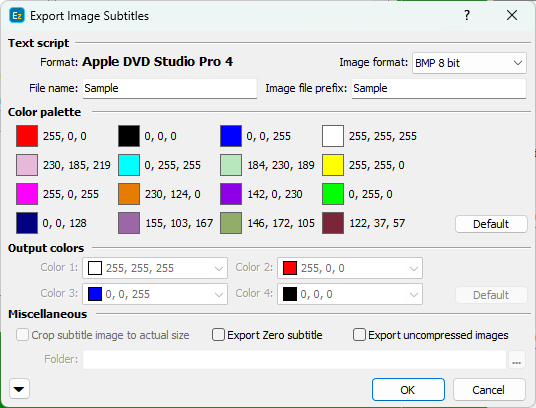 The output colors section is available only for DVD systems that use 4 colors. As a general rule Color 1 corresponds to the image's Background, Color 2 is the Outline, Color 3 is the anti-aliasing and Color 4 - the Text's color. Some of the DVD authoring systems allow changing the colors while other use fixed colors. That's why for some DVD authoring systems the editing is disabled and the colors are displayed for reference only. Note: Please mind the colors selected here are not the presentation colors of the subtitles as they will be rendered by the DVD player. These colors are used internally and will be replaced by the actual ones by the DVD authoring software. |