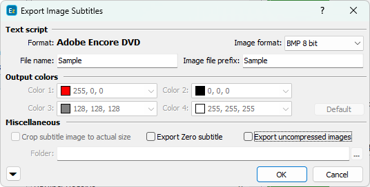 The output colors section is available only for DVD systems that use 4 colors. As a general rule Color 1 corresponds to the image's Background, Color 2 is the Outline, Color 3 is the anti-aliasing and Color 4 - the Text's color. Some of the DVD authoring systems allow changing the colors while other use fixed colors. That's why for some DVD authoring systems the editing is disabled and the colors are displayed for reference only.
