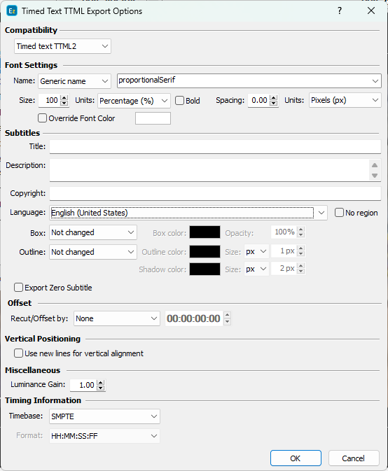 TTML2 supports spacing by utilizing the tts:letterspacing attribute. Letter spacing could be specified and exported in the output as long as a measurement unit from the respective drop-donw menu: pixels (px) and Ems (em). When Default is select, letter spacing will not be applied and exported. |