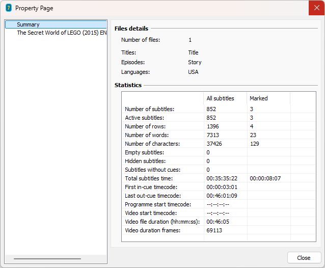 The Summary page provides combined details for all selected files. As you can see on the image above, all episodes numbers and titles are present, as well as the total number of subtitles, text lines, characters, etc. contained in all files.