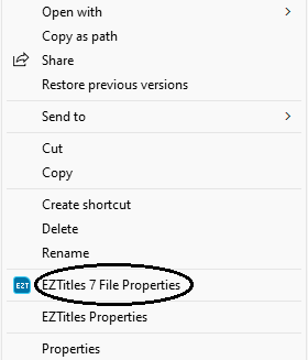 So when you navigate to the location of the .EZT files you just need to select one, right click with your mouse and select the EZTitles Properties option from the list, as shown in the image below: