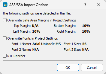 Sub Station Alpha format provides support for extensive number of features including details about the Safe Area margins and font information. Upon importing SSA or ASS file EZTitles offers the possibility to load the original settings saved in the input fie: