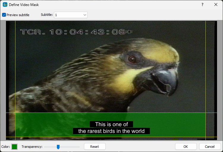 The Video Mask option allows the user to draw rectangular region which masks or covers part of the loaded in EZTitles video picture. This may sometimes be required if there are visual elements in the picture which would otherwise obscure the normal display of the subtitles in EZTitles or will simply make them hard to proof read. Added in this way Video Mask will be visible in EZTitles only and details about it will be saved in the ~info.xml which EZTitles creates when a clip is loaded.