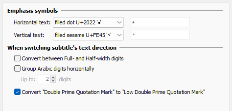 Automatically converts the Double Prime Quotation Mark inserted at the end of the quotation, i.e. the one that closes the quotation, to "Low Double Prime Quotation Mark" (U+301F) when changing subtitles orientation from horizontal to vertical.