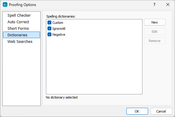 Note: Regular Expressions can be used when adding new word to a negative dictionary. This way you can include the word and all its derivatives that contain the same root word by a single entry in the dictionary. For example, if we add just one entry: negativ.*, all derivative words starting with negativ will also be underlined by the spell checker: negativity, negativeness, negatively,etc.