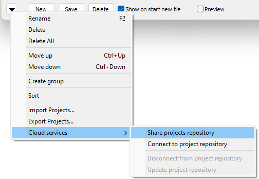 Note: If there are any modifications made to the templates in the meantime you need to get their latest versions manually. Select Cloud Services menu again and use "Update project repository". Unfortunately, the DropBox service applications doesn't provide an efficient method to verify if the shared file has been modified and needs to be updated.