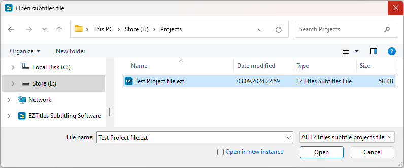 Then the program will invoke the standard Windows Open dialog box where you will have to locate your subtitle file (.EZT) and click the Open button to load it in the workspace: