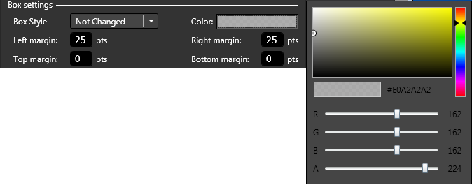 The box can be also extended to the Left, Right, Top or Bottom by entering the exact amount of points into the corresponding Left, Right, Top, Bottom margins boxes.