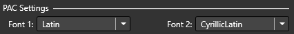 PAC files allow the use of two fonts with different encoding as showed in the image above. The following encodings are available: Latin, Cyrillic, Cyrillic/Latin, Greek, Arabic, Farsi, Hebrew, Thai, Chinese Simplified/Traditional, Japanese and Korean.