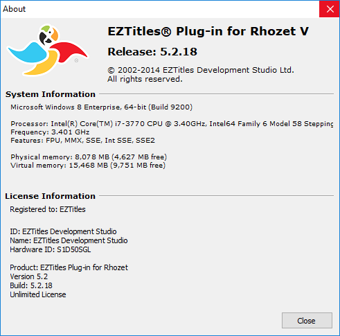 To verify if the Plug-in has been installed and registered properly click on the Windows Start button, navigate to All Programs\EZTitles Development Studio\EZTitles Rhozet Plug-in 5 and start the About application:
